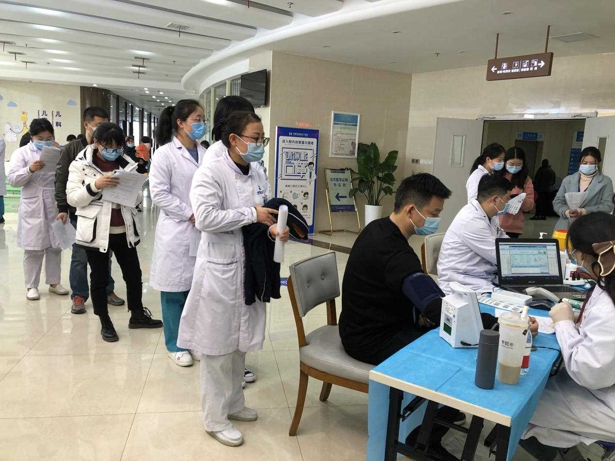 在我院二楼候诊区,报名献血的志愿者们早早来到献血活动地点,按照“测体温、登记填表、量血压、体检、化验采血、等待审核”流程,有条不紊的进行中。